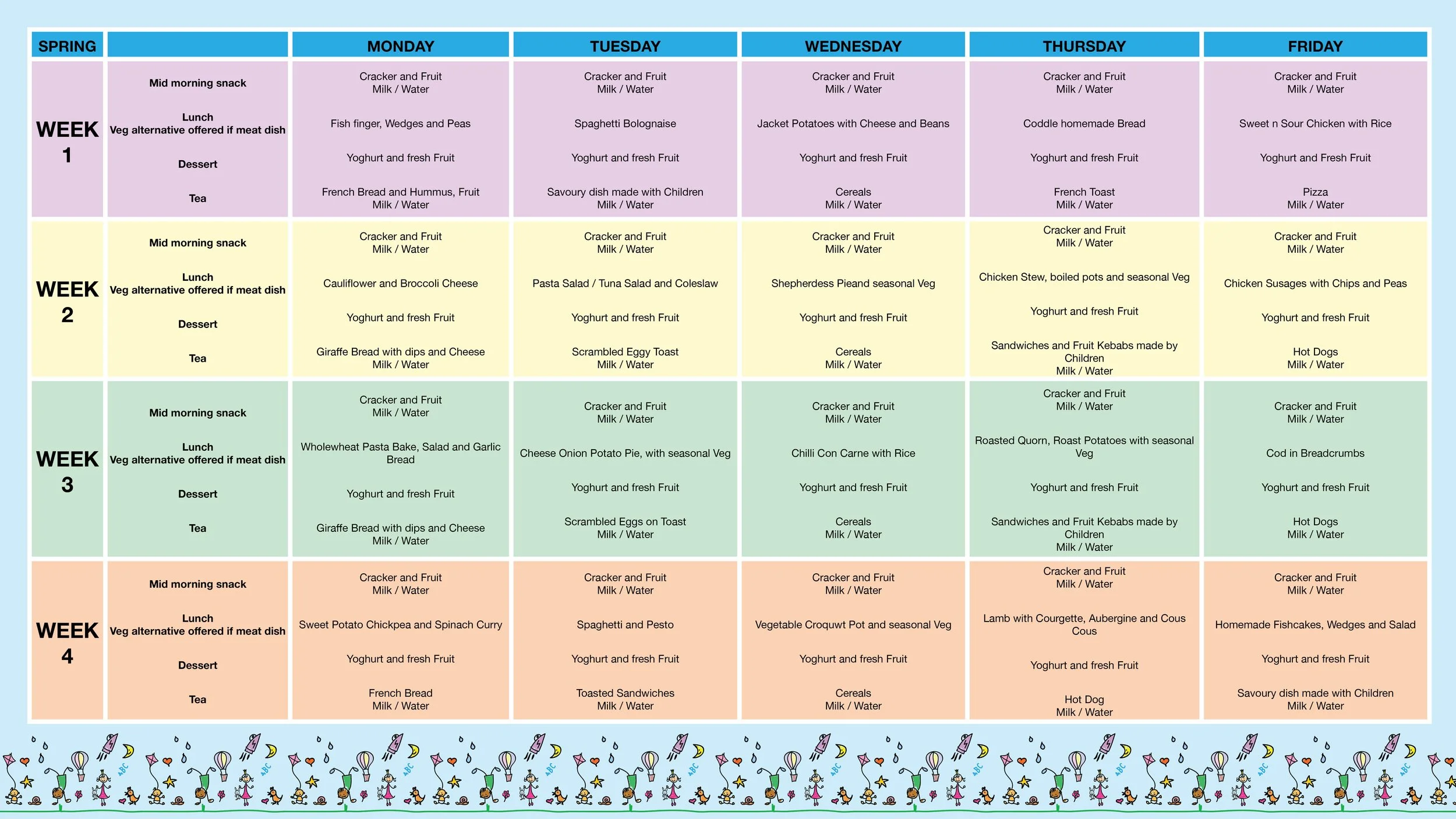 We offer a range of meals and snacks throughout the day depending on session times. Full day sessions include breakfast, a morning snack, lunch, an afternoon snack, and tea. Morning sessions include breakfast, a morning snack, and lunch, while afternoon sessions include an afternoon snack and tea. All sessions include a selection of drinks, including milk and water.